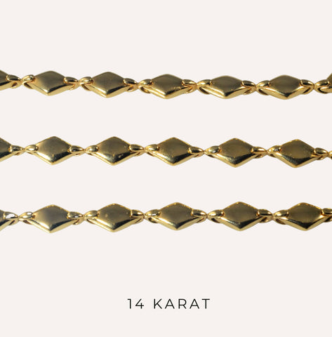 Flattened and formed into a series of small box-like shapes, the box chain is often referred to as the "Venetian chain" and is the ideal chain used when layering due to its fluid, seamless look and dainty style.